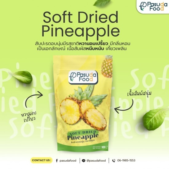 • สับปะรดอบนุ่ม: เนื้อสัมผัสหนึบหนับ เคี้ยวเพลิน รสชาติหวานอมเปรี้ยวเป็นเอกลักษณ์